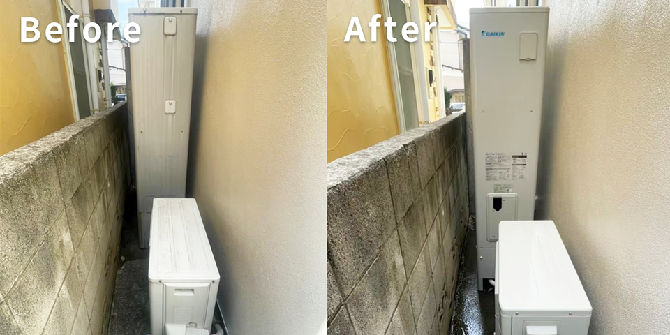 経年によりすでに一部の配管カバーが外れてしまっている状態でしたが、弊社が使用しているエコキュート専用の配管で細かい部分までしっかりと修繕いたしました👷