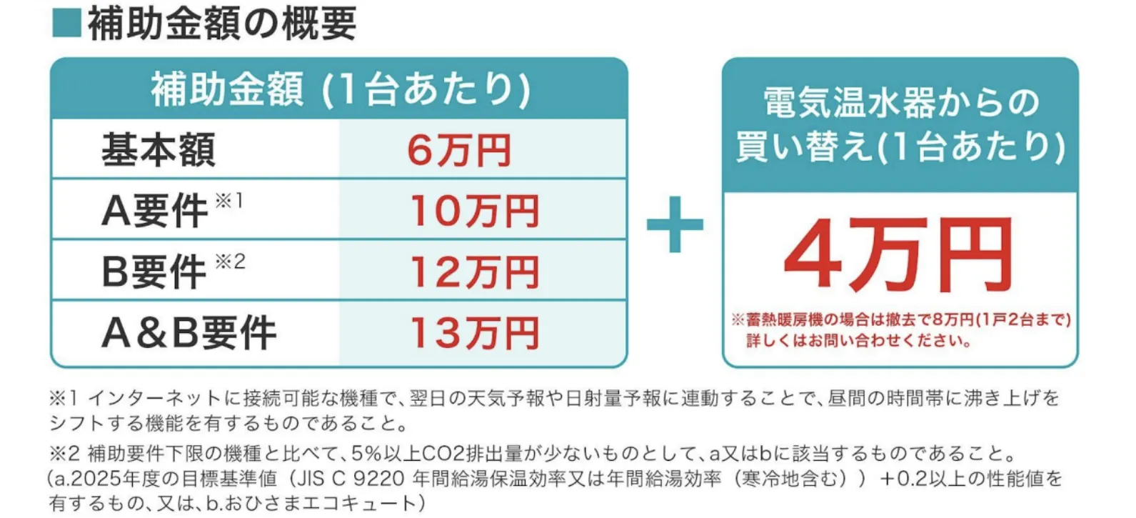 A. 条件によって異なりますが、基本額は6万円です。A要件またはB要件を満たすと10~12万円、両方満たせば13万円、さらに電気温水器からの買い替えなら最大17万円となります。