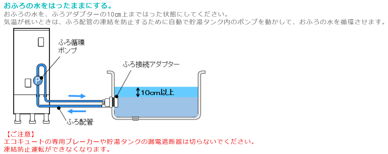 エコキュートは通常、外気温0℃以下になると配管の中にある水が凍るリスクが高まります。