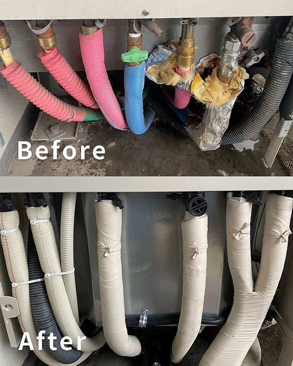 劣化により配管カバーがボロボロになってしまっていましたが、