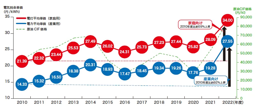 ▼東日本大震災以降(2014~2016年・コロナ禍を除いて)電気料金は上がり続けている。