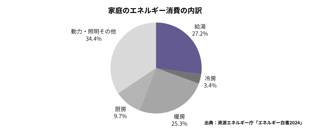 実は、経済産業省・資源エネルギー庁が毎年公開している「エネルギー白書」によれば、家庭で使うエネルギーのうち約27〜28%は「お湯(給湯)」が占めているんです!
