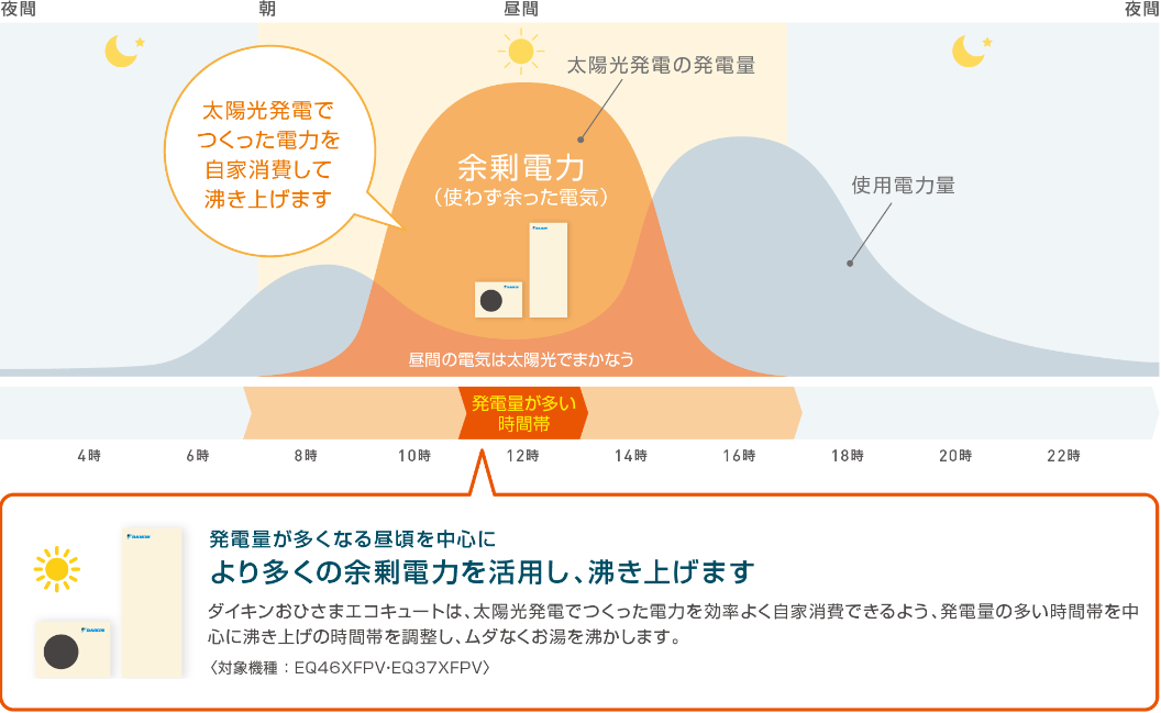 一般的なエコキュートは電力の安い夜間に沸き上げを行うのに対し、おひさまエコキュートは太陽光発電の余剰電力を利用して昼間に沸き上げを行います。