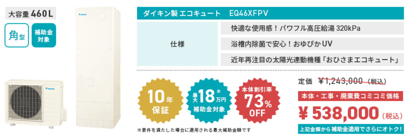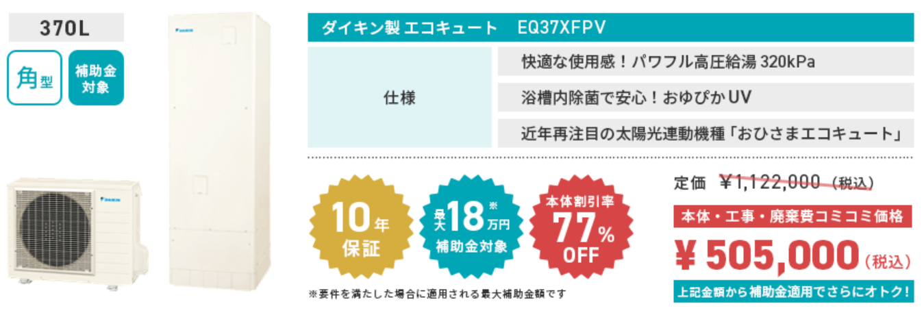 「おゆぴかUV」「パワフル高圧給湯」など、便利な機能を搭載したダイキン製おひさまエコキュート。