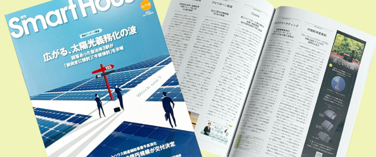この度、未来の暮らしを考えた住宅建築商材やエネルギー機器に関する業界専門誌「月刊Smart House」No.116_2024年10月号(9月20日発刊)に、弊社代表・重田淳平のインタビュー記事が掲載されました!